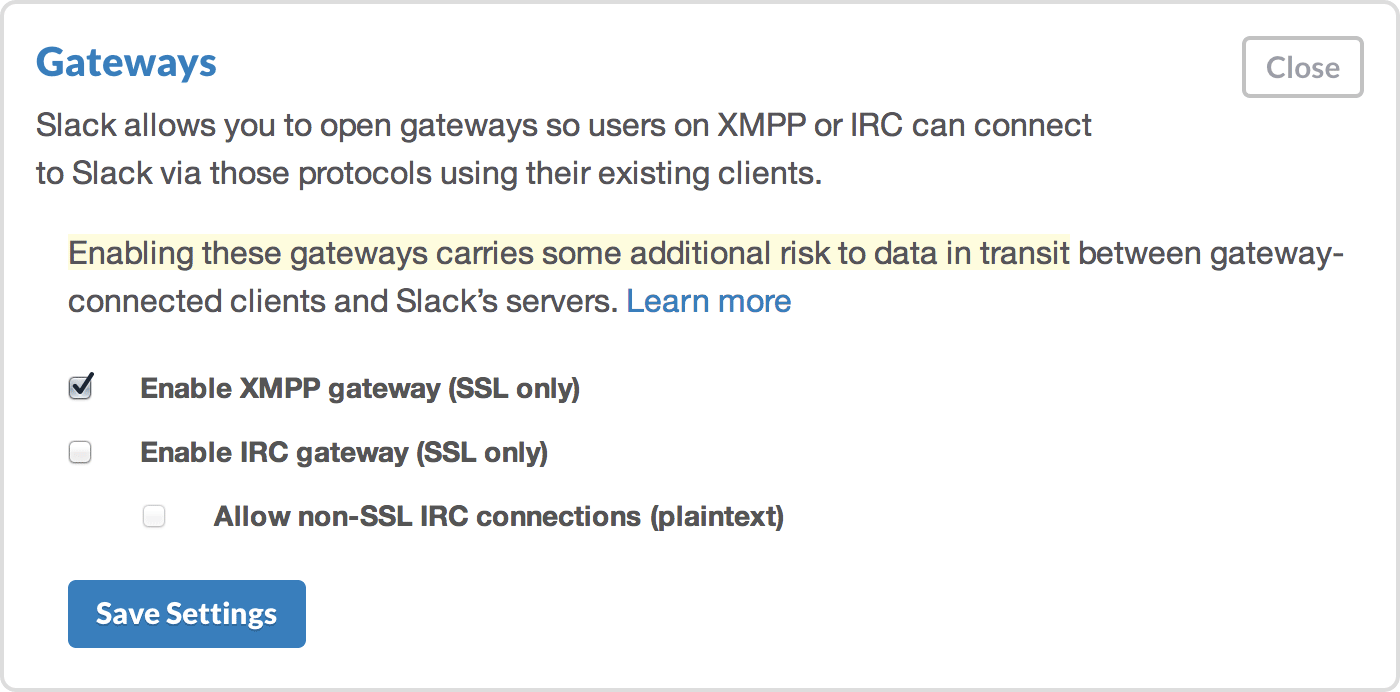 Admin Settings の Gateways セクションを展開し、上記の様に、XMPP を有効にします。