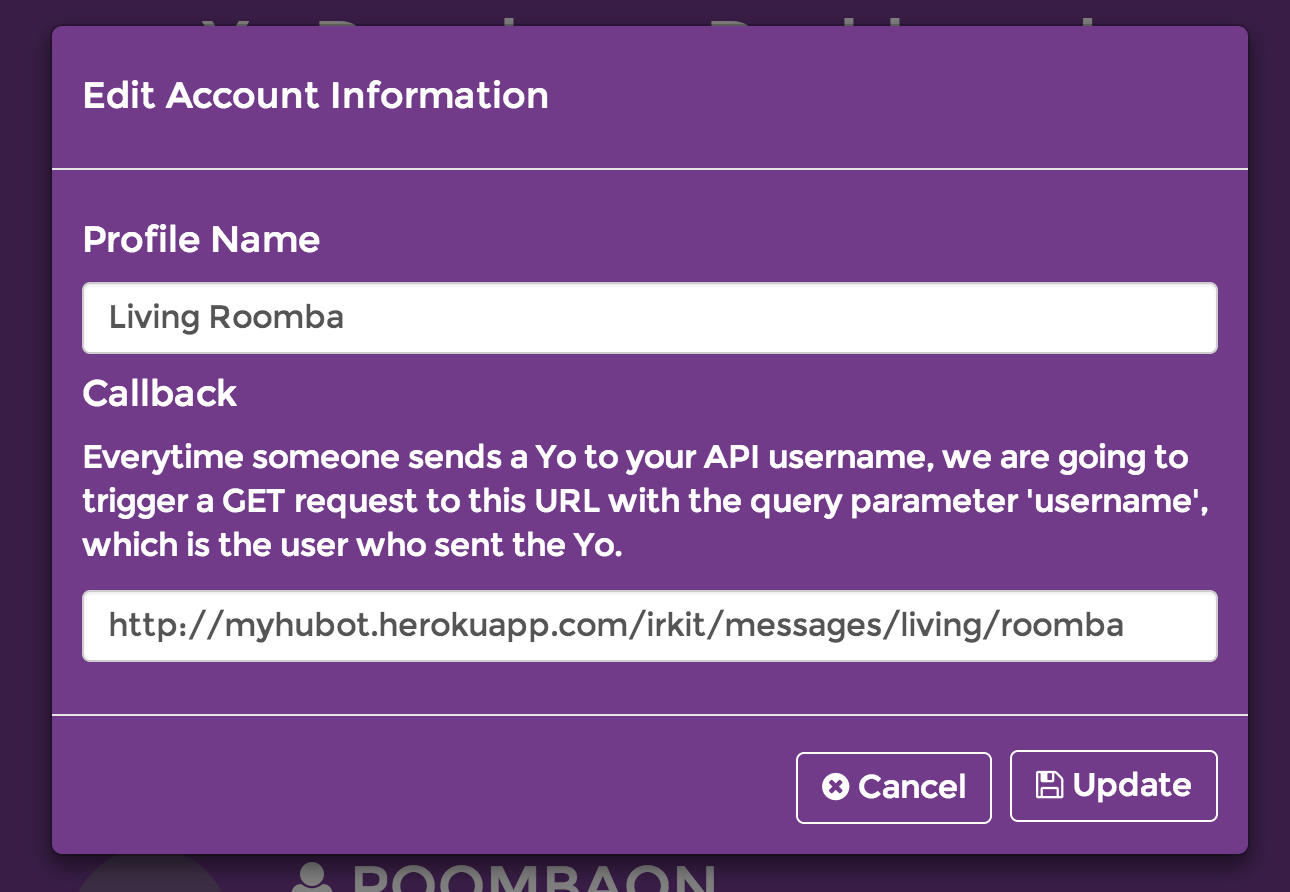 動画は Yo API のコールバックを契機に Roomba を起動するデモです。