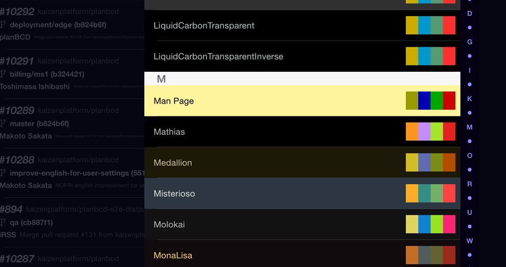 iTerm2-color-schemes で公開されている、116 のカラースキームから、お好みのものに変更できます。