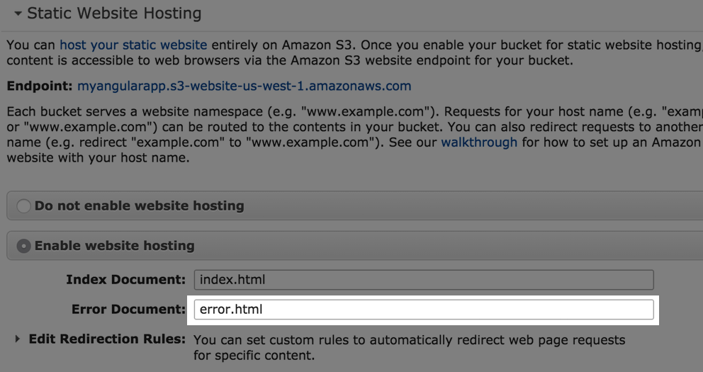 この error.html を Amazon S3 のコンソール上でエラーページとして設定しておくことで、HTML5 mode の AngularJS アプリケーションで、リロードされた場合も、/index.html に実装されている本体に転送し、リロード前の状態を復元することが可能になります。