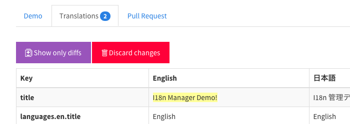 適当に文言を変更して、enter キーを押下すると、変更が送信され、翻訳一覧 (Translations) 画面に、差分がハイライトされます。