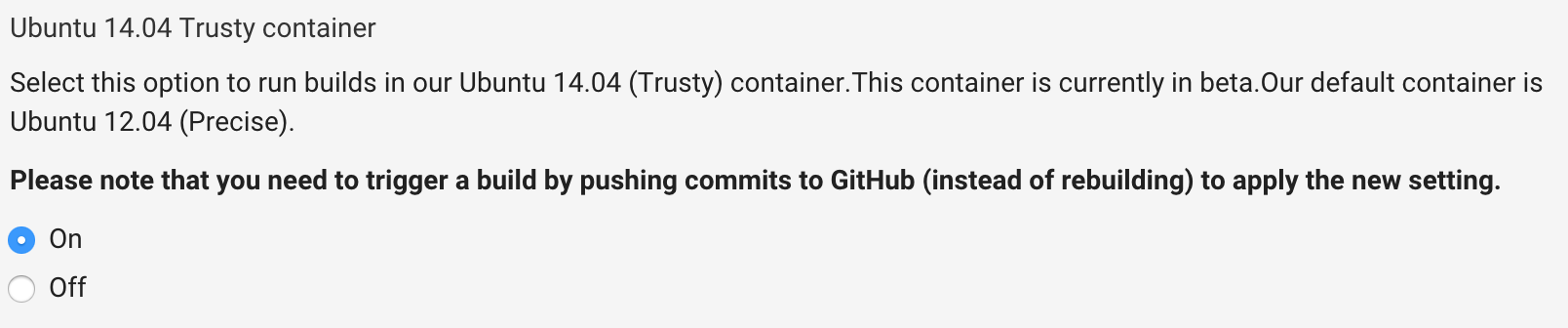 それに合わせて、パブリックベータとして提供されている、CircleCI の Trusty コンテナを採用しました。