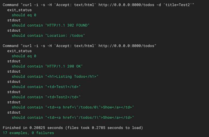describe command("curl -i -s -H \'Accept: text/html\' http://0.0.0.0:8000/todos -d \'title=Test#{n}\'") do