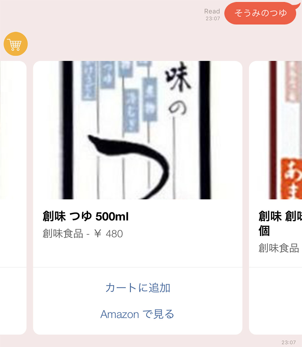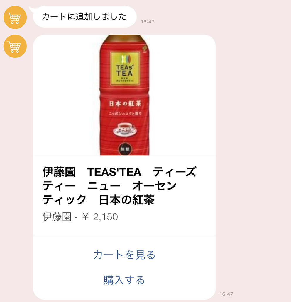 ボットが返信した商品の カートに追加 ボタンをタップすると、やりとりを行なっているチャット内でのみ有効なカートに商品が追加されます。