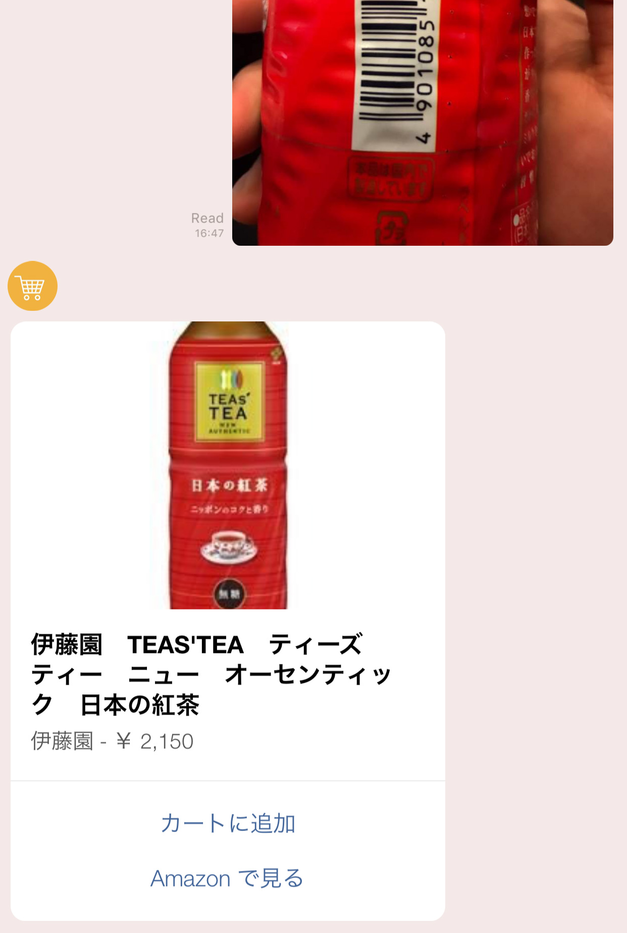 手元にあるものと、同じものを購入したい場合、バーコードの写真をとって、ボットに送ります。