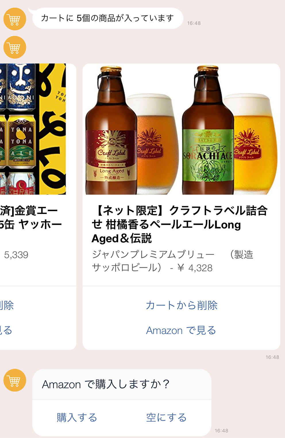 Amazon で購入しますか? というメッセージの 購入する ボタンをタップすると、ウェブブラウザが開き、Amazon.co.jp のカートにまとめて追加できます。