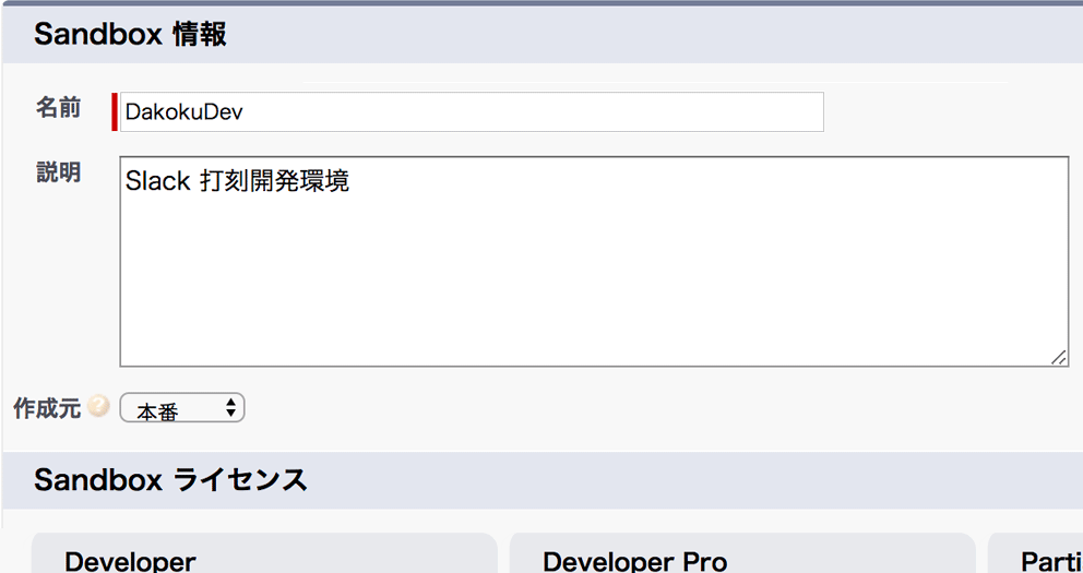 名前 と 説明 欄には 任意の内容 を入力し、 Sandbox ライセンス は Developer を選択します。