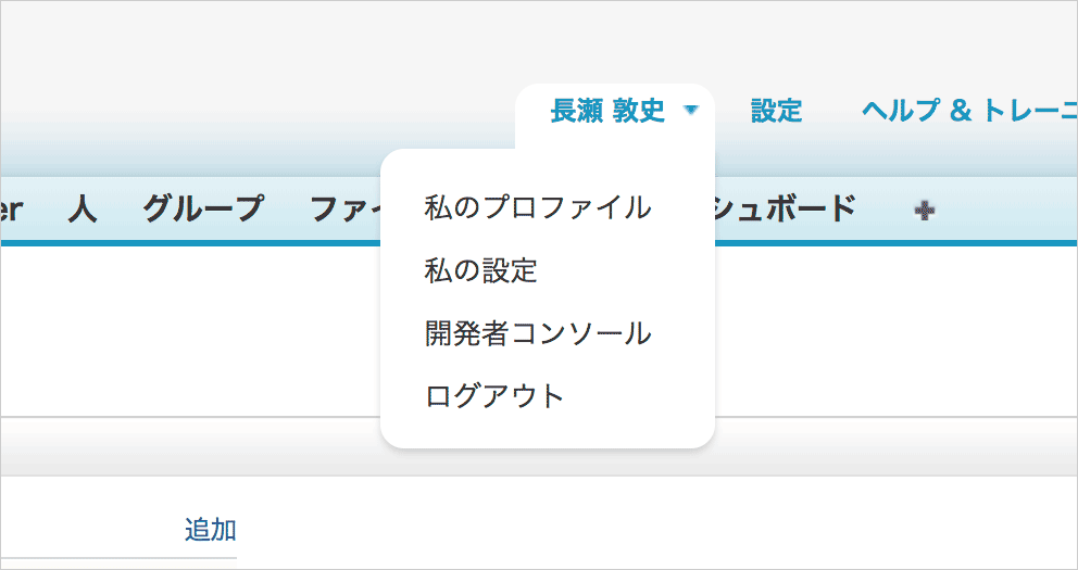 Sandbox 環境画面右上にある、ログインユーザーの名前をクリックし、ナビゲーションを展開、 開発コンソール を開きます。