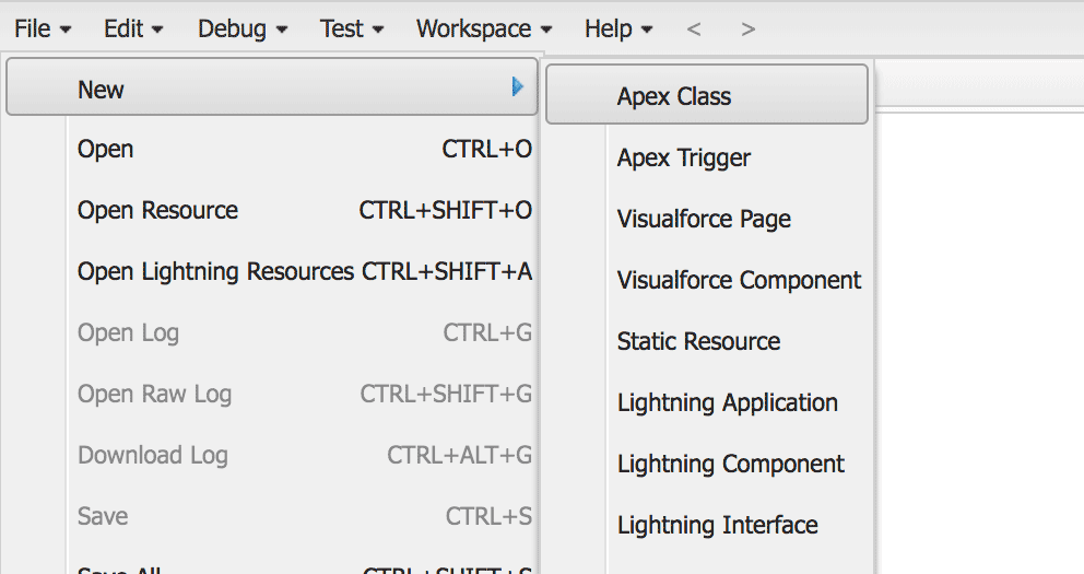 管理コンソール左上メニューバーから File > New > Apex Class を選択し、 TSTimeTableAPIController, TSTimeTableAPIControllerTest という名前の Apex クラスを作成します。