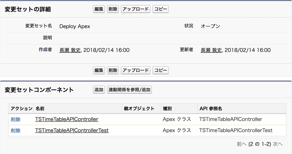 - Sandbox より、送信変更セットを使い、Apex コードを本番環境にアップロードする