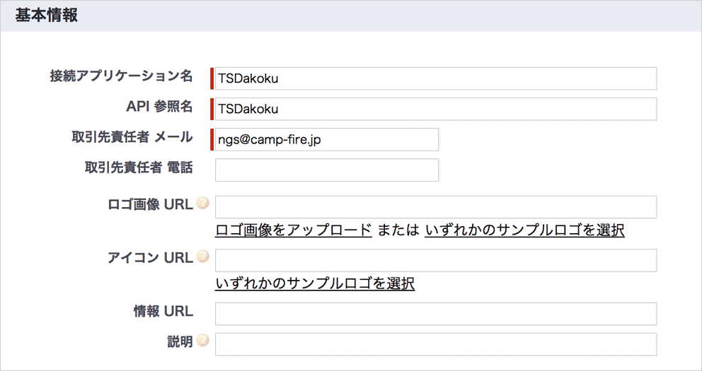 基本情報 セクション内 接続アプリケーション名 , API 参照名 , 取引先責任者 メール は任意の内容を入力します。