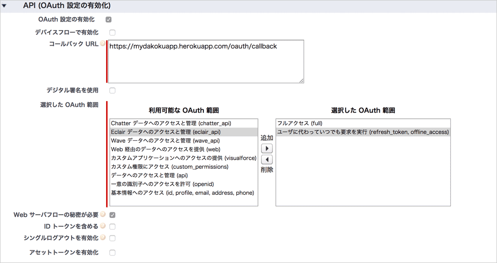 コールバック URL は、後述のアプリケーションデプロイ先を URL を元に、 https://{ホスト名}/oauth/salesforce/callback の形式で入力します。
