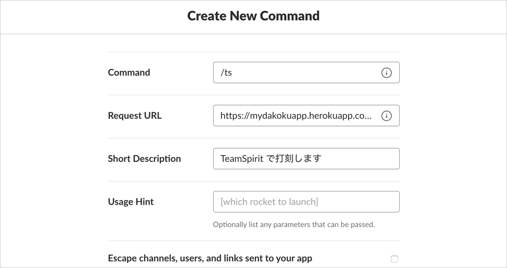 https://{ホスト名}/hooks/slash - Short Description (任意): 例: