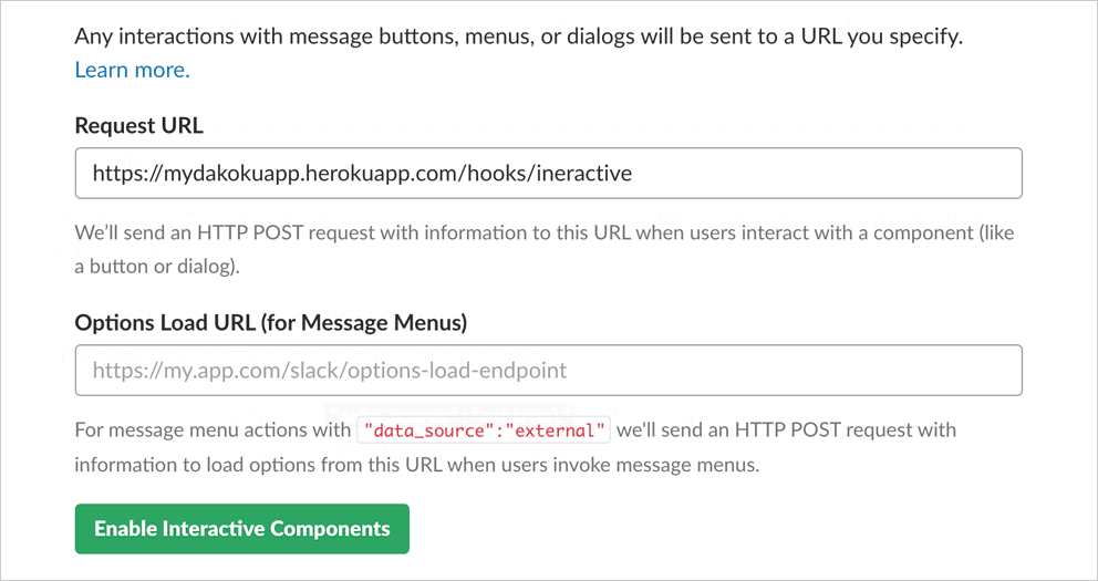 Interactive Components 画面で、 Enable Interactive Components ボタンをクリック、 Request URL に https://{ホスト名}/hooks/interactive のフォーマットで URL を入力し、緑の Enable Interactive Components ボタンをクリックし、保存します。