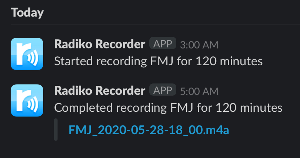 ここまで設定すると、定時実行され、AWS S3 に 音声データが定時に保存され、上の画像の様に Slack チャネルに通知が飛びます。